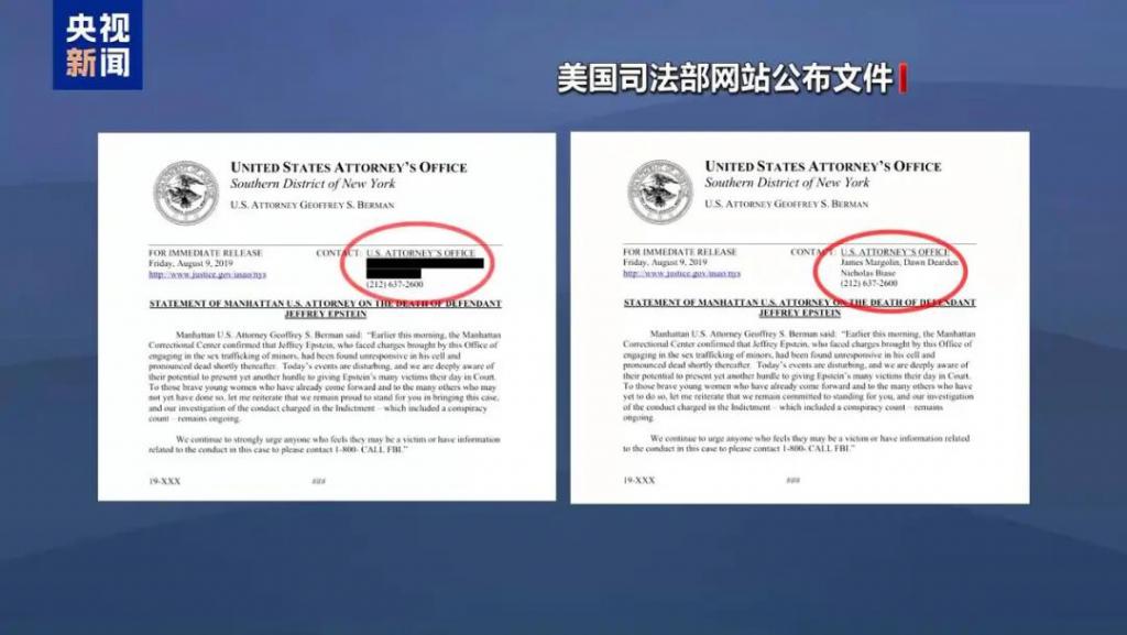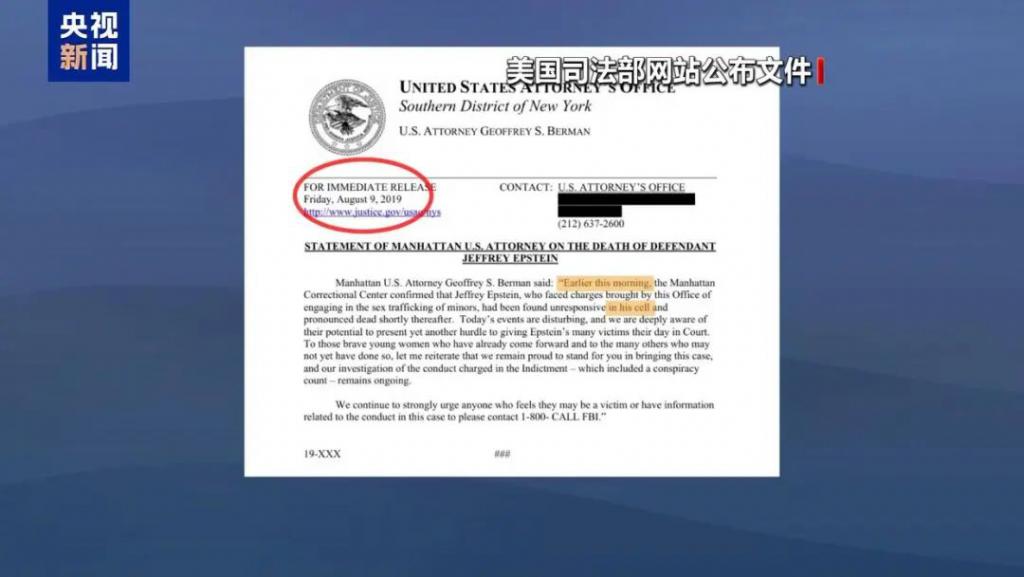 此外,有消息显示,上月底公布的文件中,还有美国纽约南区联邦检察官办公室的死亡声明草稿,内容是爱泼斯坦于 " 今天早间 "" 在其牢房中 " 身亡,日期赫然写着 "2019 年 8 月 9 日 ",也就是爱泼斯坦死亡的前一天。与后来公布的正式声明不同,这个 " 早产 " 的声明草稿没有提及 " 疑似自杀 " 的字样,仅模糊表述为爱泼斯坦 " 不省人事,随后被宣告死亡 "。