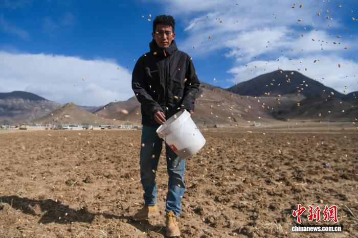2 月 8 日,西藏拉萨林周县黑颈鹤巡护员桑珠在田间播撒小麦,为黑颈鹤补充食物。中新社记者 江飞波 摄
