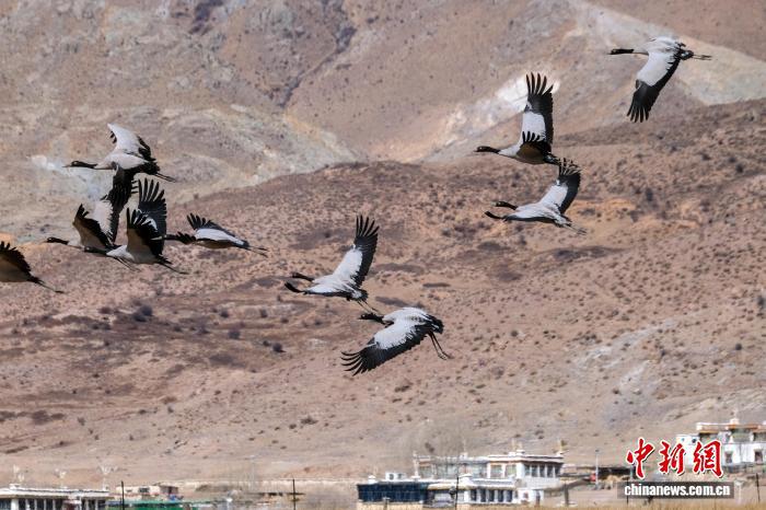 2 月 8 日,一群越冬黑颈鹤飞过拉萨市林周县春堆乡卡东村上空。中新社记者 江飞波 摄