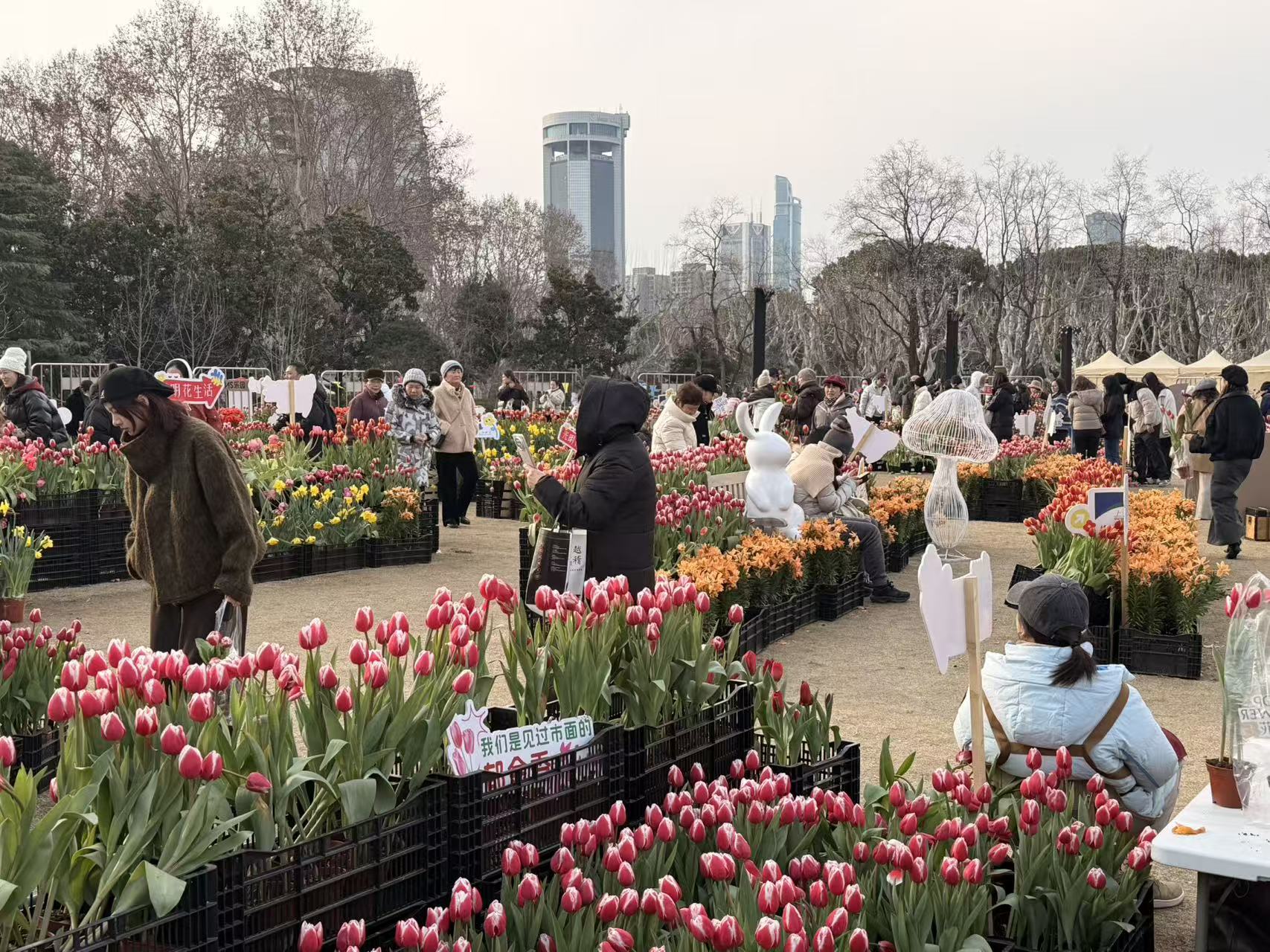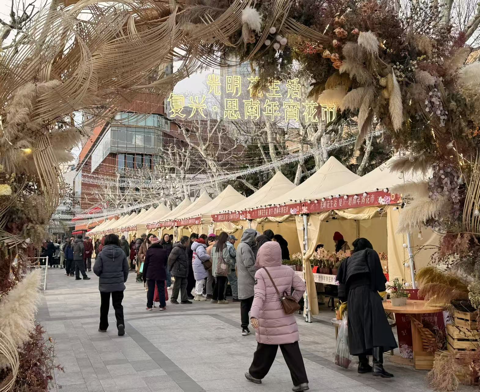 比如,她住在前滩,最近一个周末和先生带着两个孩子去了家附近前滩公园巷的新春集市打卡。而她上班的地方在徐汇滨江的西岸,所以很自然地在这几天中午午休的时候都会去西岸梦中心的年集逛一逛,有一次下午和客户约了在那儿的咖啡店喝咖啡,还巧遇了西岸的“财神”。而在这之前,她说自己还去逛了思南公馆里的年宵花市,抢到了29.9元10支的带球郁金香和一盆同样“非常便宜”的蝴蝶兰。