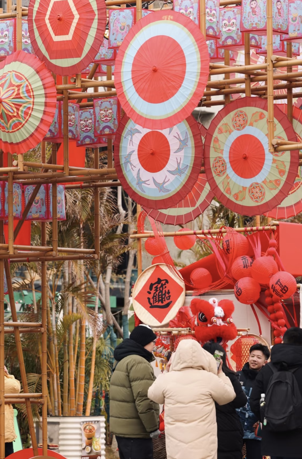 界面在市集现场看到,不少顾客在购物同时,在油伞灯廊、风车装置、“财神”互动等场景下留影。社交网络上不少顾客拍摄的照片、视频都收获了不错的阅读数据。在这些帖子的标题和评论区,最常见的描述是,“有年味”、“像穿越了”。