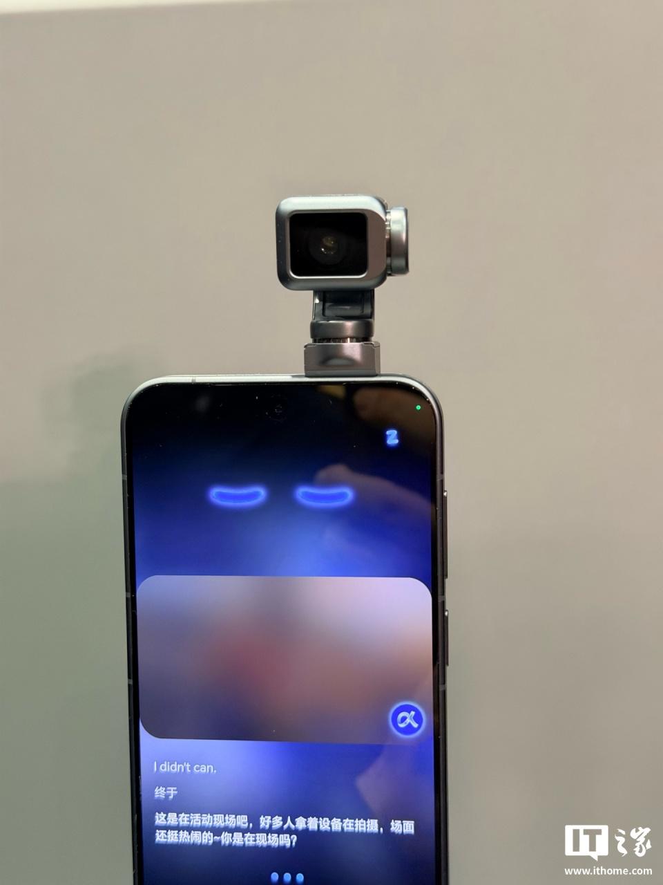 外观方面,Robot Phone 通体银灰色,边框则是采用了拉丝装饰。看起来就是一台正常的智能手机,只不过顶部多了个有点像大疆 Osmo Pocket 的三轴云台相机,同时背面还有 "α"Logo,彰显该机的特殊之处。