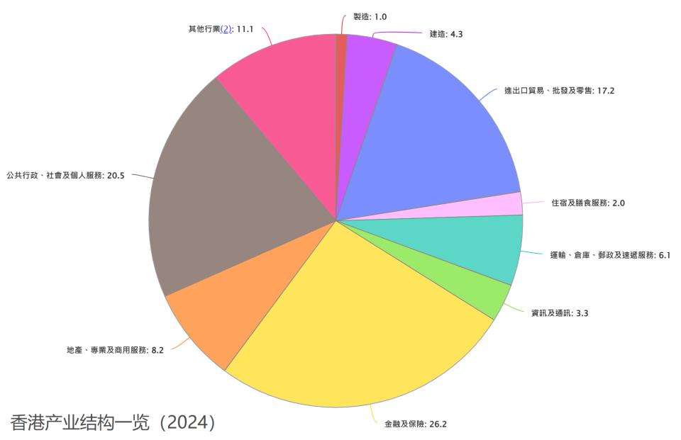 此番新晋的香港地区,则以服务业为绝对主导,第三产业占比长期保持在 93% 以上,制造业占比仅为 1% 左右。