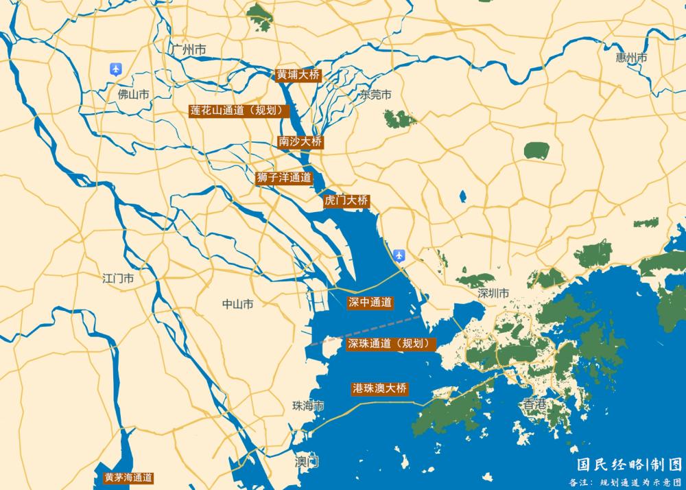 从硬联通来看,在珠江口,将有 11 座跨海大桥横贯其上,包括港珠澳大桥、深中通道、虎门大桥、南沙大桥,以及正在规划中的深珠通道,大幅压缩时空距离。