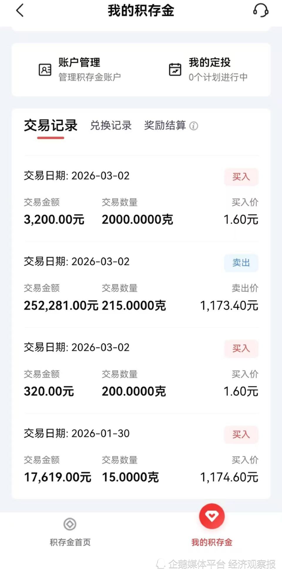 " 从上午 9 点开始,这个价格大概持续了十几分钟。" 上海的张女士也发现了这个 bug。她一直关心国际局势和黄金价格走势,预判 3 月 2 日开盘后金价会上涨,因此一早便紧盯北京银行的积存金交易界面。上午 9 点开盘后,她发现积存金报价竟然低至 1.60 元 / 克,起初以为是显示异常,尝试买入 1 克并成功成交后,又花费 160 元买入 100 克积存金。
