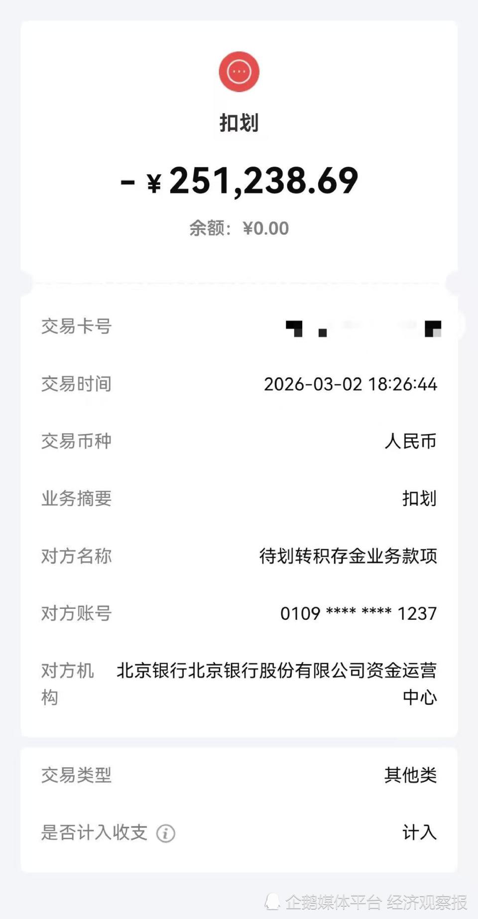 18 时 26 分,陈女士发现账户资金已被全额扣划,扣划方也是北京银行资金运营中心。