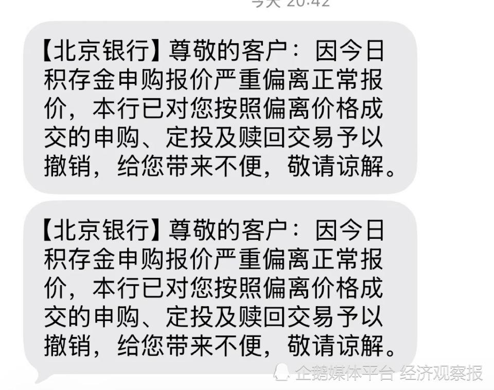 投资者展示的截图显示,20 点 42 分,北京银行发送短信:因今日积存金申购报价严重偏离正常报价,本行已对您按照偏离价格成交的申购、定投及赎回交易予以撤销,给您带来的不便,敬请谅解。