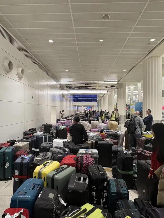 2 月 28 日王先生滞留机场时拍摄的照片,满地是旅客的行李箱 受访者供图