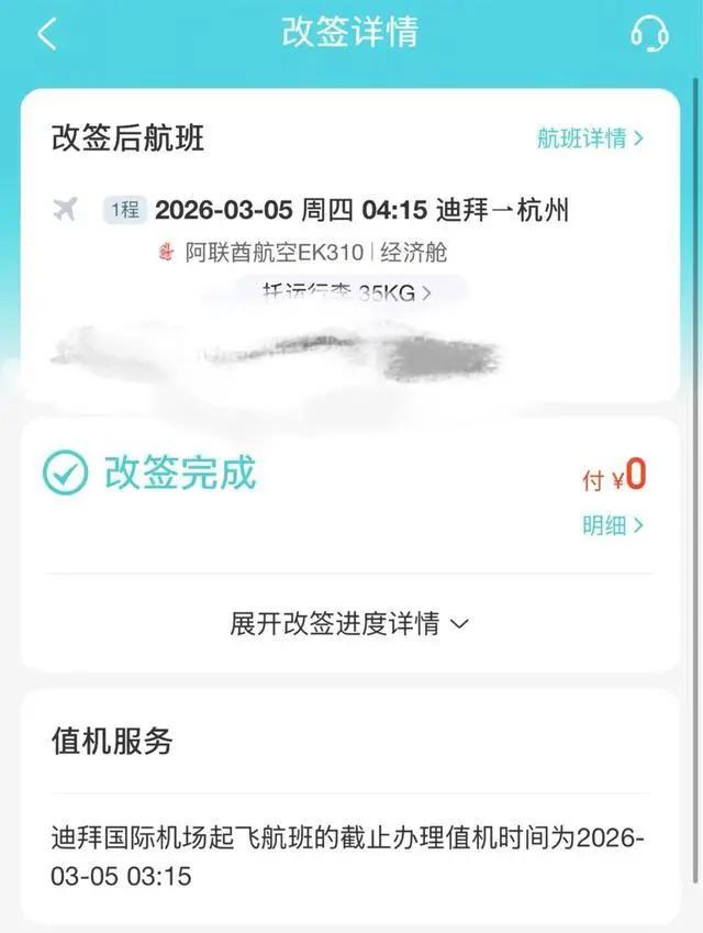 浙江衢州姑娘曾曾也决定在迪拜等机场开放和航班重开,她告诉记者,昨天刷的时候是没有机票的,但今天机票成功改签到了 3 月 5 日。订票平台客服表示会 100% 保证旅客行程,只要没有取消,当天直接去机场就能飞。