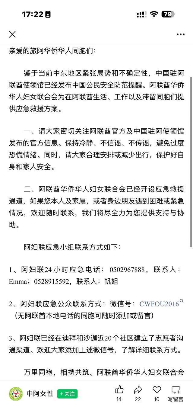 王女士也给记者发来阿联酋华侨华人妇女联合会的应急安全提醒,提醒显示,若有需要滞留旅客可以联系阿妇联。