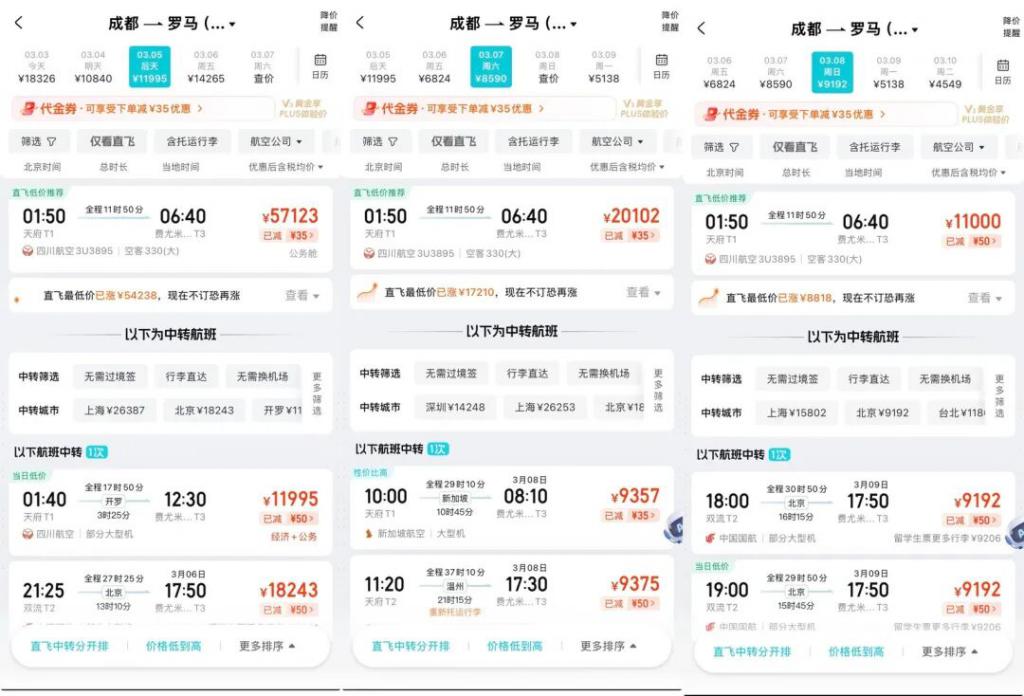 罗马是欧洲热门直飞目的地之一。成都至罗马最近航班为 3 月 5 日,经济舱已售罄,公务舱票价 57123 元(不含税),7 日经济舱价格则涨至 20102 元,较前一周最低价上涨超 17000 元。该航线每周执飞四班,分别为周二、周四、周六、周日,飞行时长 11 小时 50 分钟。