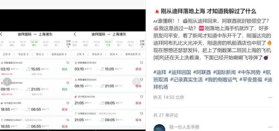 同样在这天,有人幸运地踏上最后的航班从中东回到上海,落地时发现 " 逃过一劫 "。" 现在想想还瑟瑟发抖,赶上了倒数第二班回上海的飞机。" 有人这样写下心情。