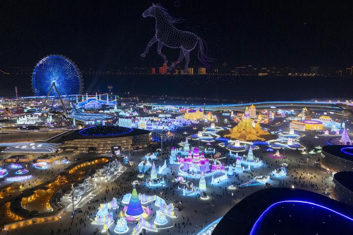 这是 2026 年 1 月 5 日拍摄的哈尔滨冰雪大世界园区的无人机表演(无人机照片)。新华社记者 张涛 摄