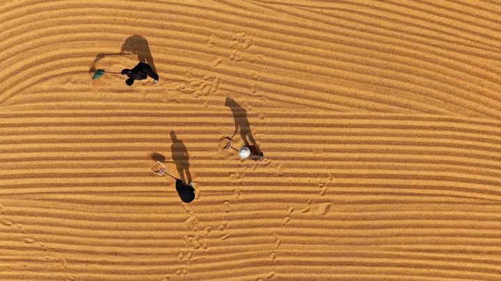 2025 年 10 月 28 日,在山东省枣庄市市中区税郭镇,农民晾晒收获的玉米(无人机照片)。新华社发(孙中喆 摄)