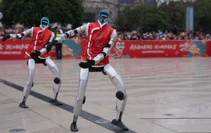 2026 年 2 月 28 日,宇树科技人形机器人在浙江省桐庐县中心广场表演舞蹈。新华社记者 黄宗治 摄