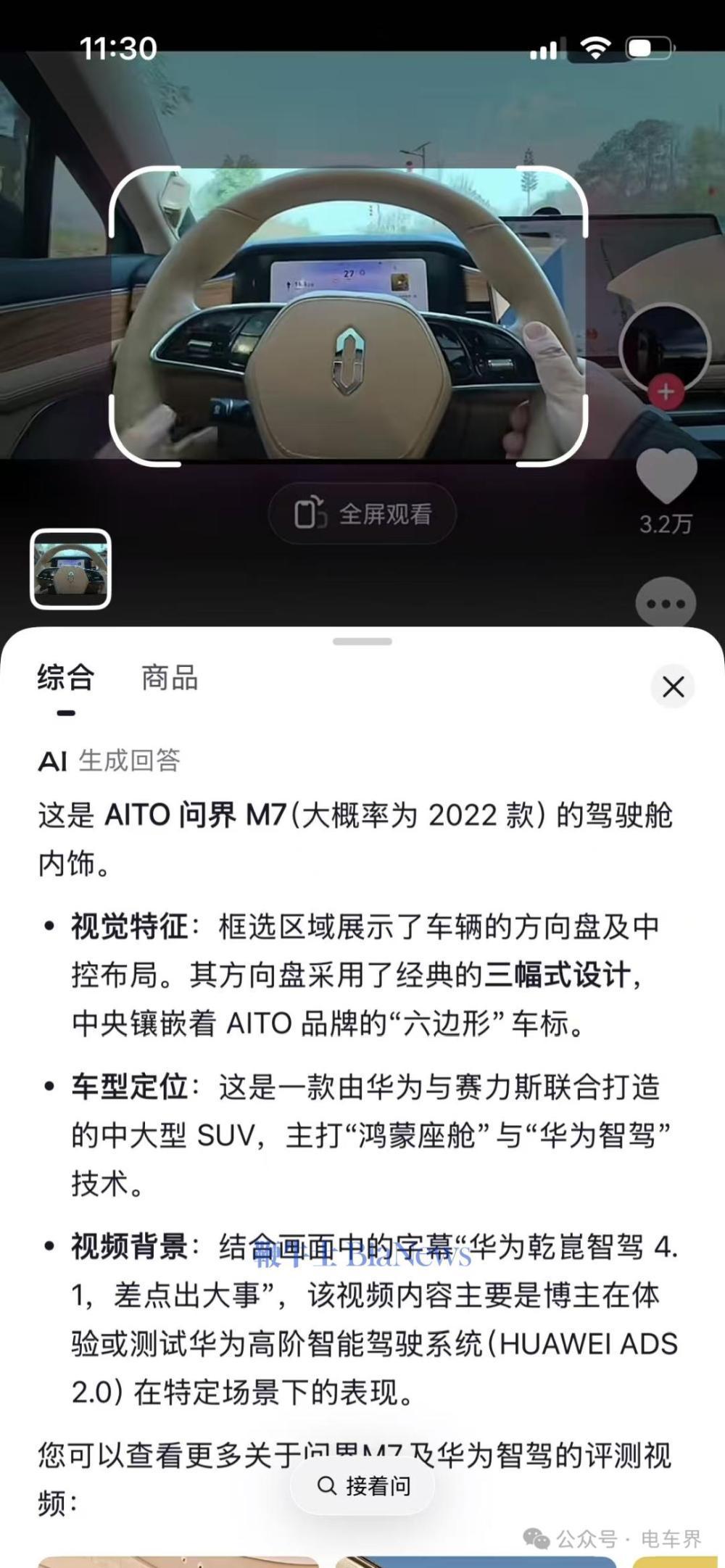 小编又找了张没有花屏的问界驾驶舱视角照片,这次抖音里的 AI 识别为 " 问界新 M5 纯电版 ( 搭载华为乾崑智驾 ADS4.1 ) 的第一人称驾驶视角截图 "。