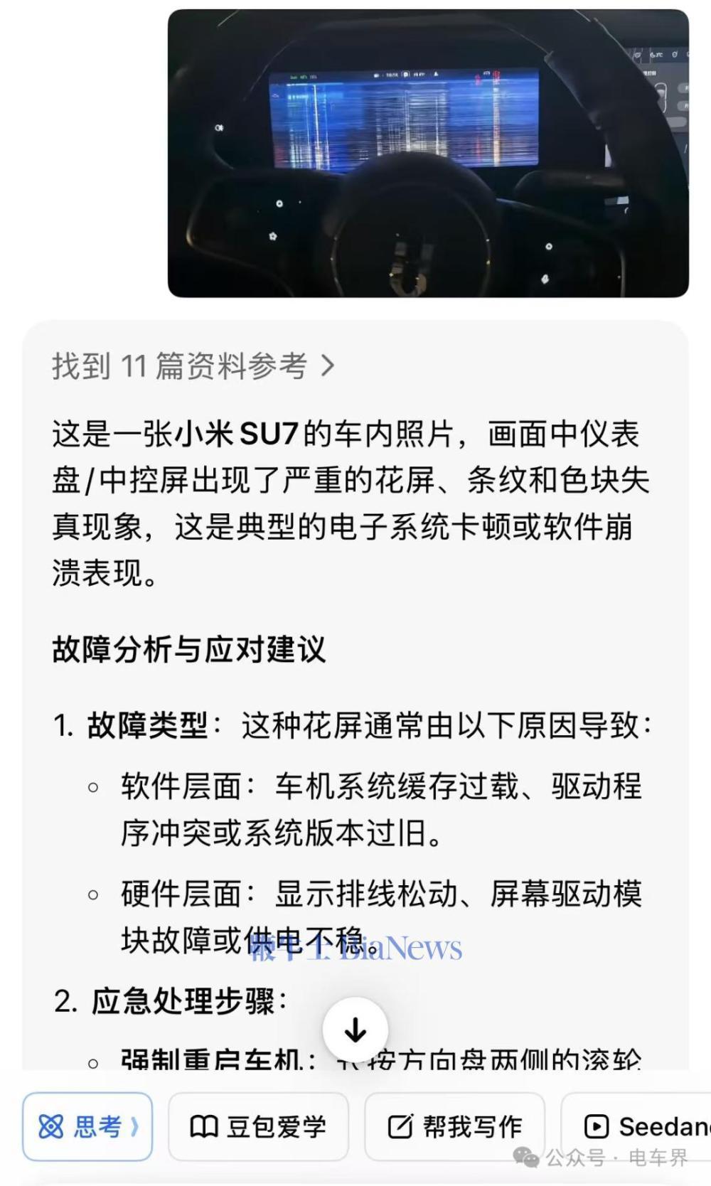 小编又将花屏的照片扔给豆包,结果识别出来的又是小米 SU7。