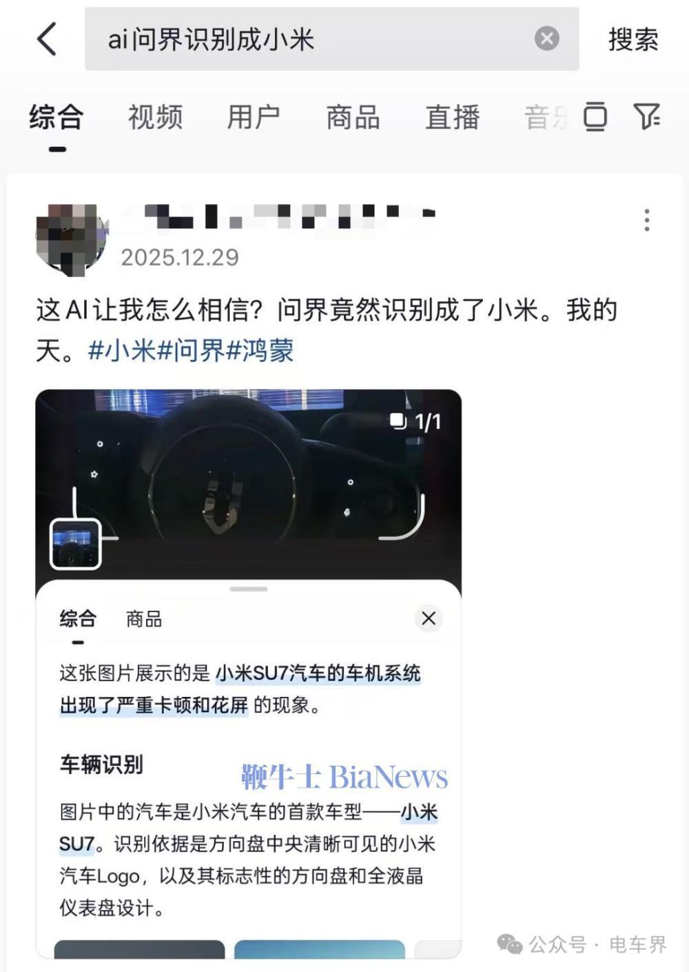 AI把花屏问界认成小米SU7