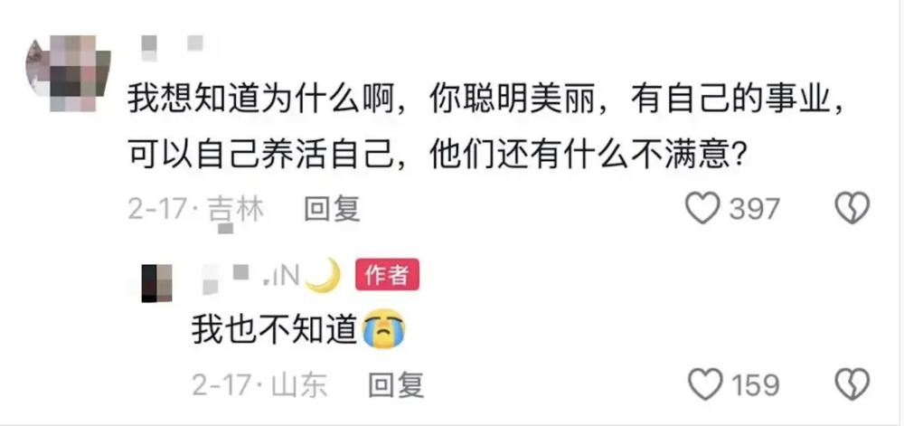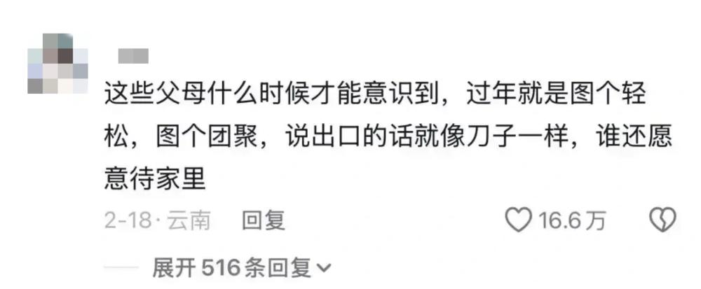 同样困境的年轻女性在她的评论区里互相取暖。她们几乎都没有度过一个平稳的新年,家庭矛盾大多是一致的:催婚,催生,催上岸,哭穷,阴阳怪气,指责埋怨。