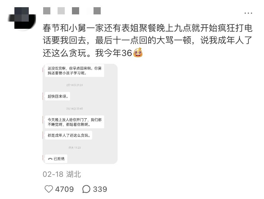有人是 36 岁的成年人,还要被父母唠叨 " 晚上没有按门禁时间回家 ";有人独自在外打拼多年,一回到家里还是要被批评 " 走路要挺胸收腹 ";有人刚下地铁站,就被要求给父母 60 万首付,都多余出高铁站,不如直接原地买张票掉头就走。