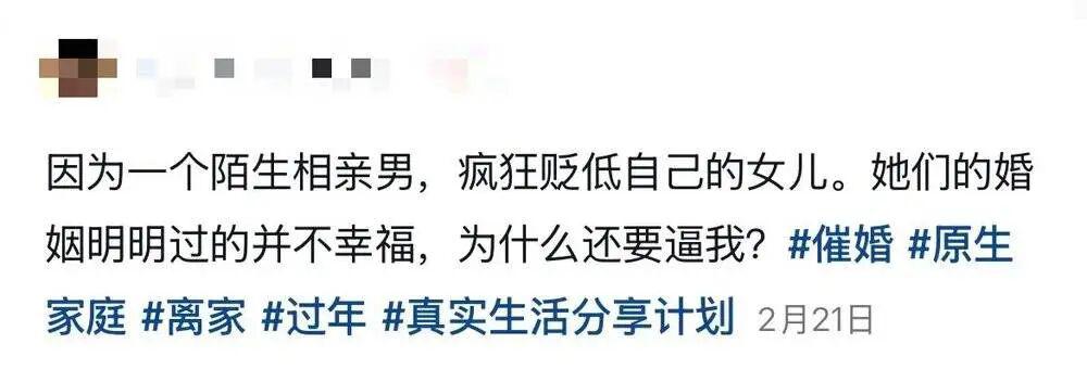 她的文案很短,几个字就写清楚了过年跑路的原因:" 因为一个陌生相亲男,疯狂贬低自己的女儿,他们的婚姻明明过得不幸福,为什么还要逼我。"