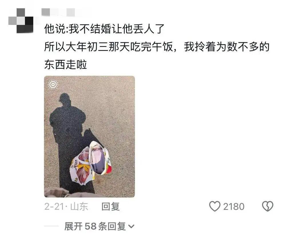 大年初一,阿甘就坐上了回京的地铁。她对除夕的回忆,只是与父母弟弟吃了一顿沉默的饭," 哪怕假期有十几天,我也只愿意在家里最多待五天 "。