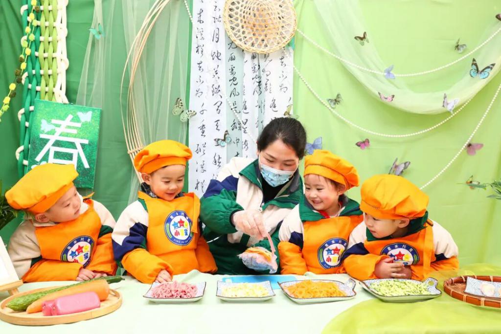 2 月 3 日,江苏海安市一家托育中心里,孩子们在老师指导下学包春卷。顾彬斌摄