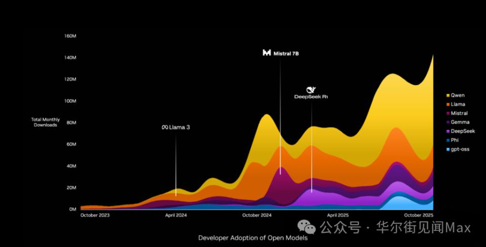 在这里,开源模型发挥着至关重要的作用。世界上大部分的模型都是免费的。研究人员、初创公司、大型企业乃至整个国家,都依赖开源模型来参与到先进的 AI 浪潮中。当开源模型达到最前沿水平时,它们改变的不仅仅是软件,它们更是激活了跨越整个技术栈的需求。