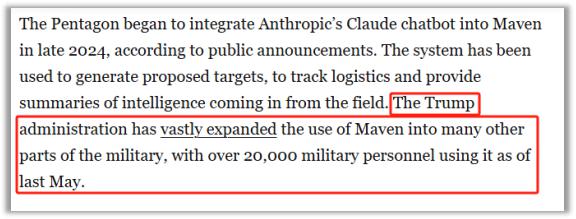 目前看来比较有效的 "AI 武器 " 是帕兰提尔和其他技术公司一起研制的 Maven 系统,据媒体报道,它可以让美军极大地降本增效——用 20 人的团队就能完成原来 2000 人的工作量。