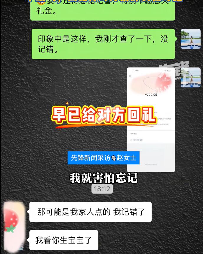 赵女士遇到了一件让她哭笑不得的事,前同事离职多年后突然发来信息要求返还礼金。据赵女士介绍,这位前同事是在 2021 年 9 月给自己随的礼金,之后不到一个月,这位同事便离职了。2022 年 7 月,自己在朋友圈看到这位前同事生子,怕日后忘记欠下人情债,她立刻将 200 元礼金转了回去。此后,两人再无联系。