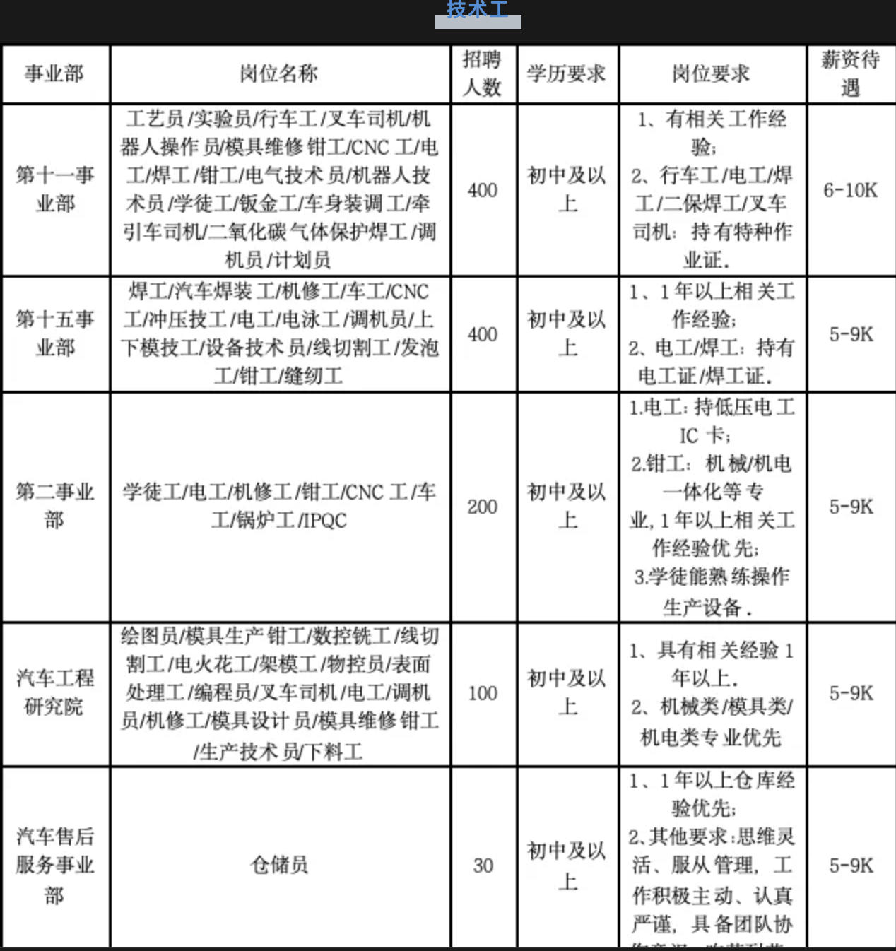 此次深汕基地计划招聘的2000名工人中,操作工人招聘需求超1000人,月薪范围为5500元-6500元;技术工人招聘需求超过1100人,主要面向电工、焊工、钳工、CNC工、叉车司机等持证技术人员,月薪跨度较大,从5000元到10000元不等,其中部分技术岗位月薪最高可达1万元。从岗位要求看,招聘主要面向初中及以上学历。
