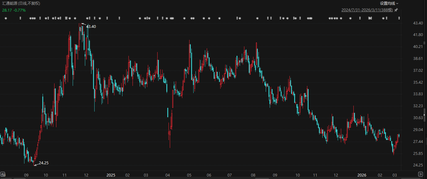 2025年一整年,该公司股价波动下行,年底较年初累跌近14%,较2024年12月初变更实控人时股价峰值(43.28元/股)跌近三成。2026年以来,汇通能源股价仍在下探,到3月11日累跌超6%。