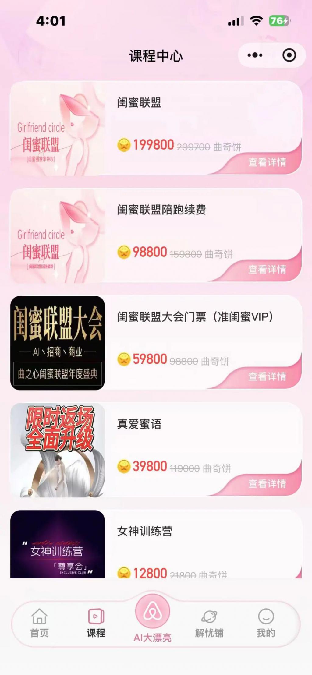 相关小程序显示,目前曲曲的课程仍以 " 金贵的关系 "、"1v1 咨询 "" 闺蜜联盟 " 等为主,其中闺蜜联盟报价超 19 万元。除此之外,她也加入了和黑白颠周媛相似的性学相关课程并售卖私密保养,其中其私人订制沙龙售价 3980 元。