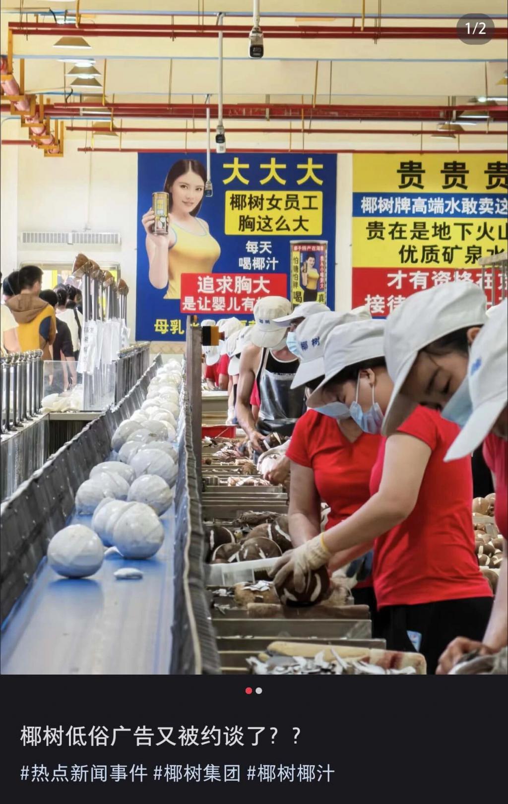 前一秒还在参观 " 最先进 " 的生产车间,切身深入了解椰树的产品文化,后一秒就看到悬挂在厂房里躲无可躲的擦边语录,空气中弥漫着的椰奶甜味瞬间就变了质感。