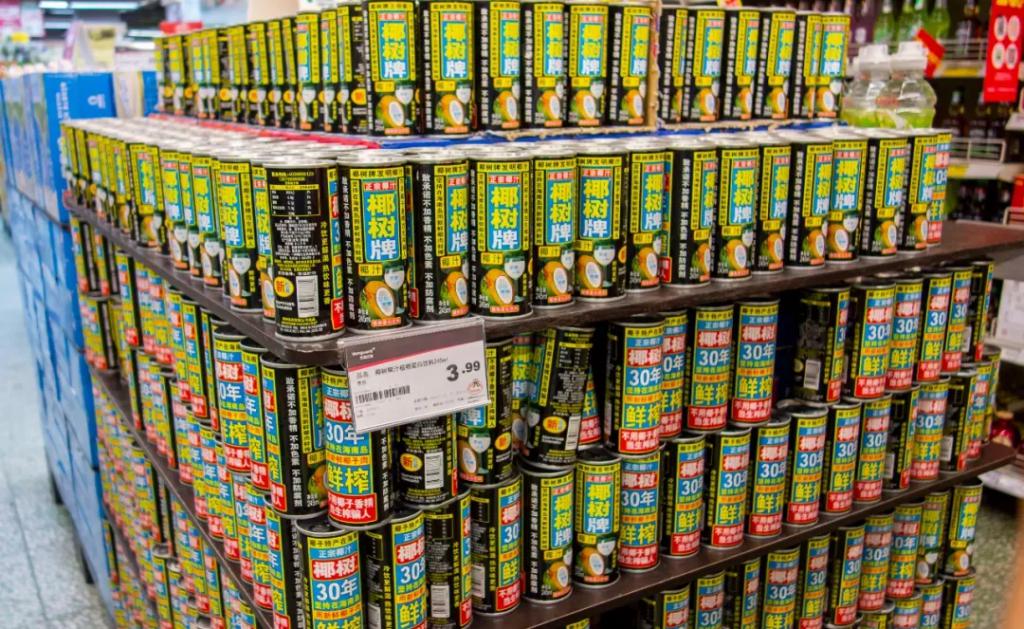" 椰汁 " 这个品类,也是从那个时候起成为中国大小商超里的平价饮品。即便后来超市货架里出现五花八门的竞品,人们想起椰汁,第一反应都是黑亮包装的椰树牌椰汁。