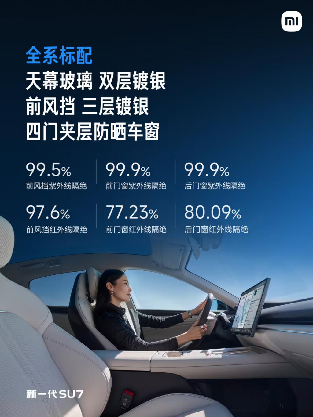 在舒适性方面,新一代 SU7 全系标配四门静音夹胶玻璃,Max 版可选超静谧座舱。Max 版标配双分区智能调光天幕,前后排天幕可单独调节,防晒隔热达到行业顶级水平。