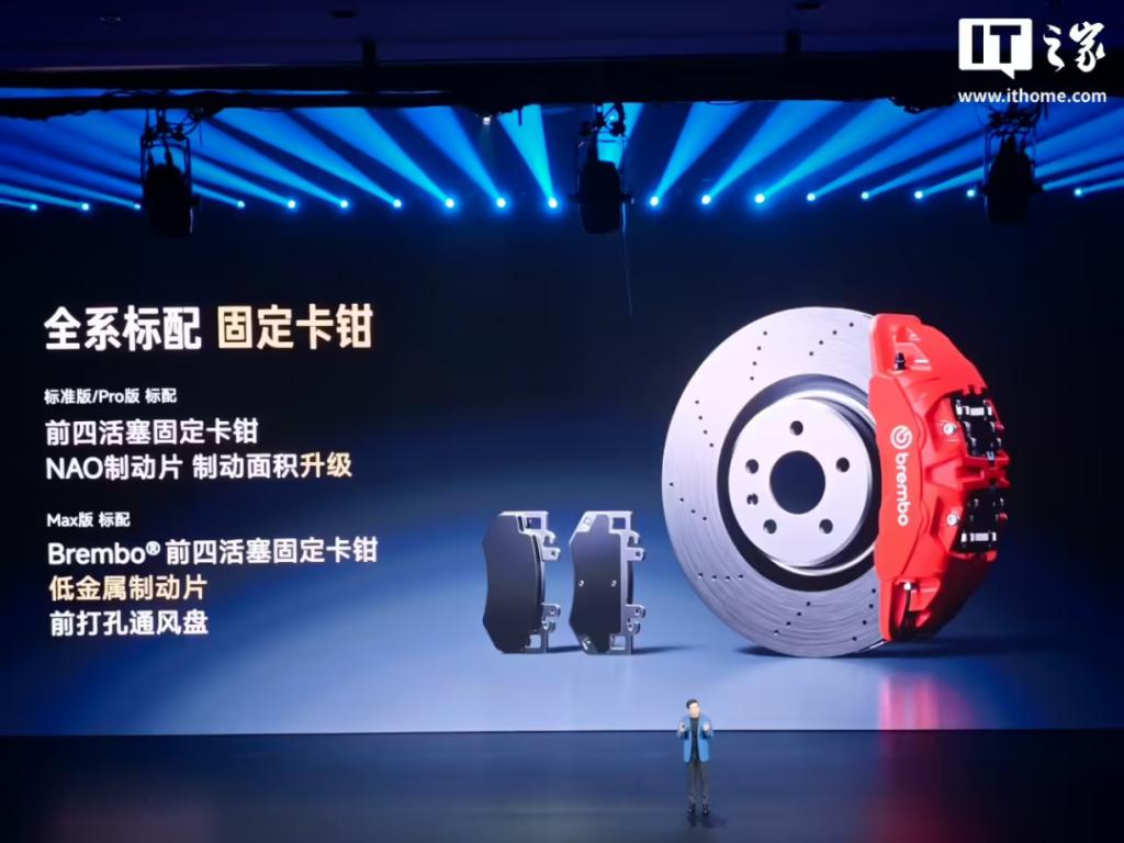 新车全系标配 265mm 后宽胎,Pro / Max 版标配闭式双腔空气弹簧、CDC 阻尼可变减振器。刹车性能升级,湿滑路面更好开,支持智能识别湿滑路面,主动提醒打开湿滑模式。