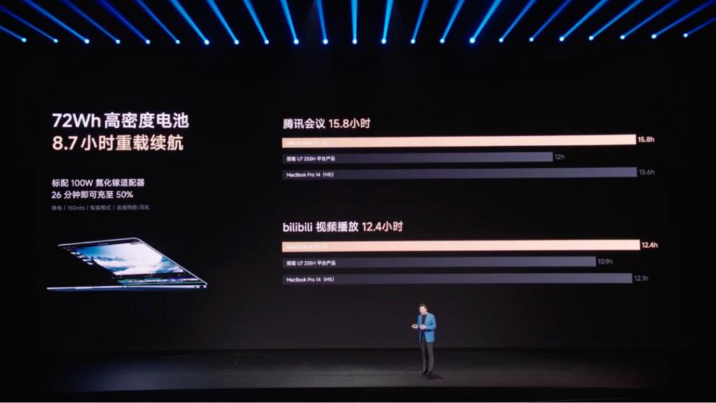 该笔记本搭载 72Wh 大电池,能量密度高达 800Wh/L,续航能够达到 19.8 小时,可以连续刷剧 12.4 小时、15.8 小时在线会议,标配 100W 氮化镓电源适配器。
