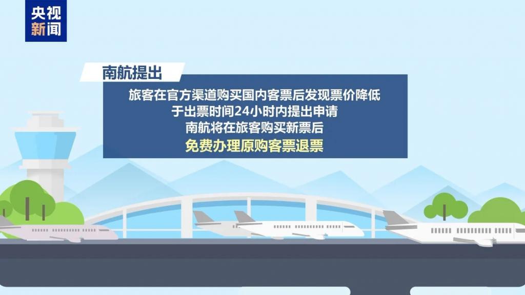南航提出:旅客在官方渠道购买国内客票后发现票价降低,于出票时间 24 小时内提出申请,南航将在旅客购买新票后,免费办理原购客票退票。