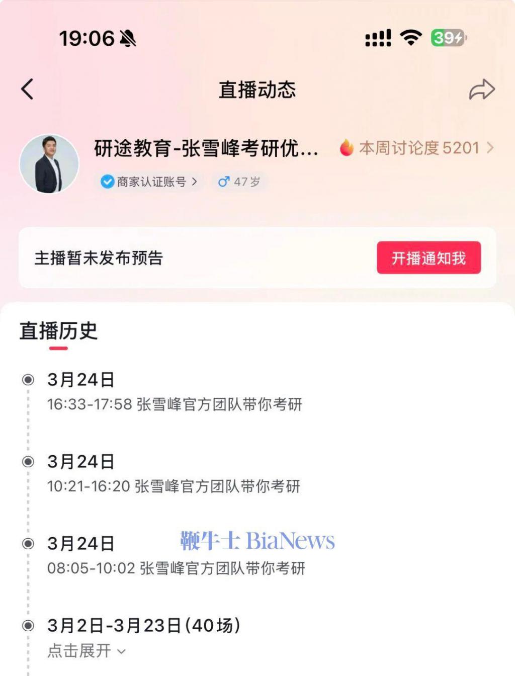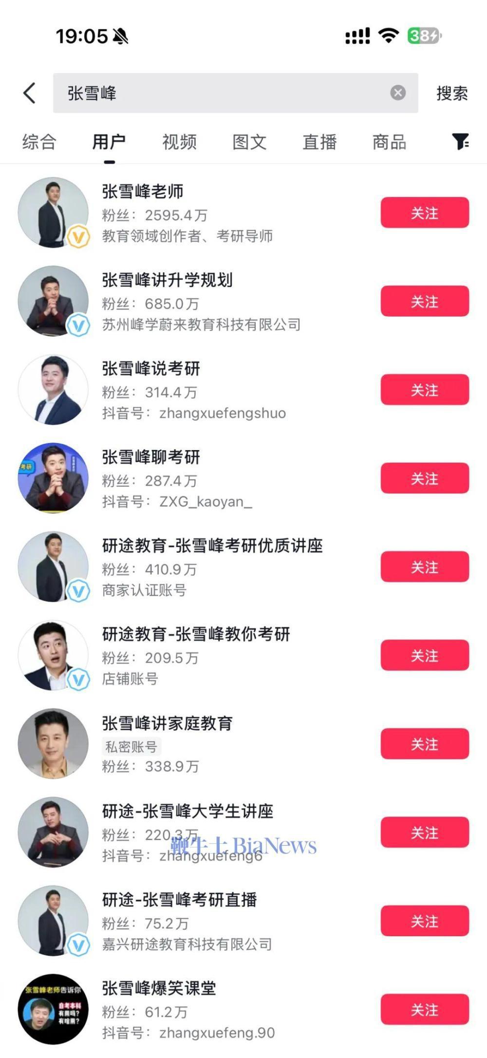 19 点,鞭牛士发现,目前张雪峰旗下矩阵号均已停播。