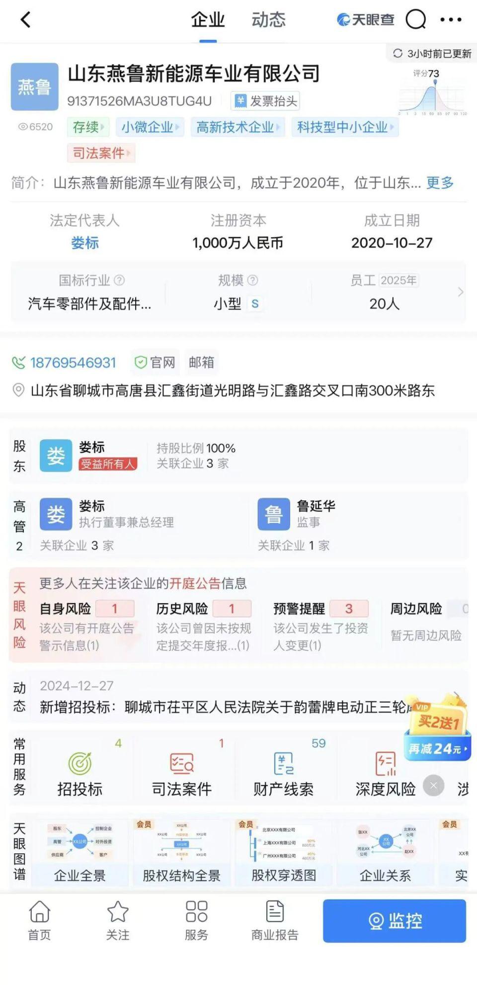 此次发起专利无效申请的公司名叫山东燕鲁新能源车业有限公司,注册地在聊城市高唐县,注册资本 1000 万元。