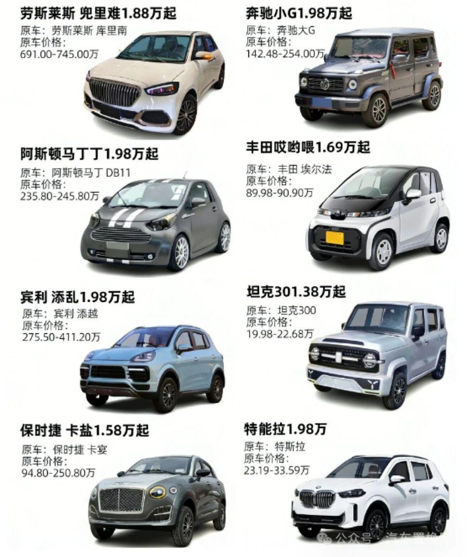 由于低速电动车与乘用车分属不同赛道,市场几乎不存在直接竞争,再加上节省设计成本和迎合消费者审美的考量,不少老头乐厂家会对热门车型进行高度还原。劳斯莱斯、保时捷、宝马、奥迪、仰望、坦克 …… 几乎每一款爆火的车型,都难逃被 " 缩小版 " 的命运。