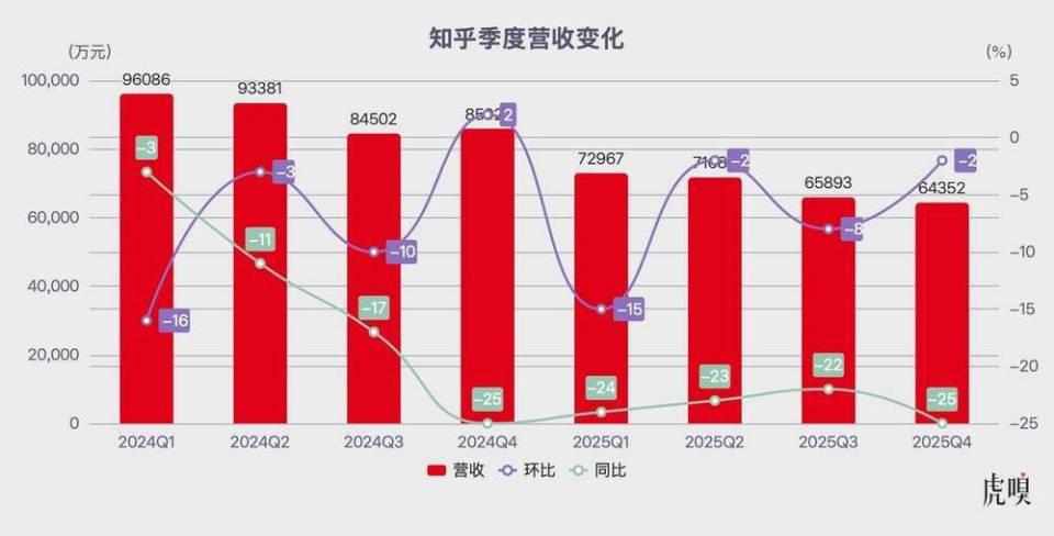 但撕开盈利的光鲜外壳,财报核心数据却难掩颓势:2025 年知乎全年营收 27.5 亿元,较 2024 年下滑 23.6%;三大核心业务全线收跌,营销服务收入同比下降 32.29%,付费会员收入同比下降 12.66%,其他收入同比下降 37.93%;全年毛利 16.48 亿元,较 2024 年下降 24.4%。