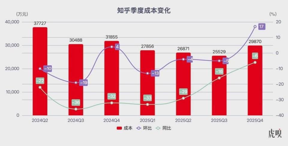 2025 年第四季度,知乎营业总成本 3 亿元,同比下降 6.2%,主要来自人员相关开支的缩减;销售及营销开支 2.75 亿元,同比下降 13%;研发开支 1.23 亿元,同比下降 16%。