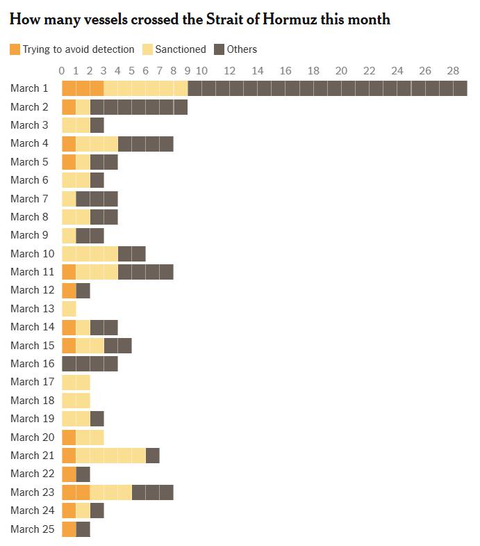 2026 年 3 月通过霍尔木兹海峡的船只数量:橙色为试图规避侦测的船只,黄色为受制裁船只,黑色为其他船只