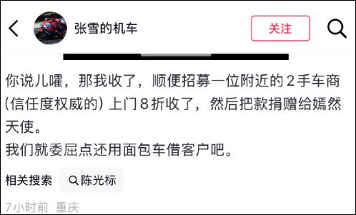 今天凌晨,张雪发文回应陈光标赠予其一辆价值 1300 万元劳斯莱斯一事:"你说儿嚯,那我收了,顺便招募一位附近的 2 手车商 ( 信任度权威的 ) 上门 8 折收了,然后把款捐赠给嫣然天使,我们就委屈点还用面包车接客户。"