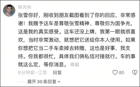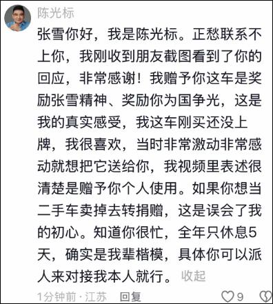 刚刚,陈光标在评论区回复张雪:"张雪你好,我是陈光标。正愁联系不上你,我刚收到朋友截图看到了你的回应,非常感谢!我赠予你这车是奖励张雪精神、奖励你为国争光,这是我的真实感受,我这车刚买还没上牌,我很喜欢,当时非常激动非常感动就想把它送给你,我视频里表述很清楚是赠予你个人使用。如果你想当二手车卖掉去转捐赠,这是误会了我的初心。知道你很忙,全年只休息 5 天,确实是我辈楷模,具体你可以派人来对接我本人就行。"