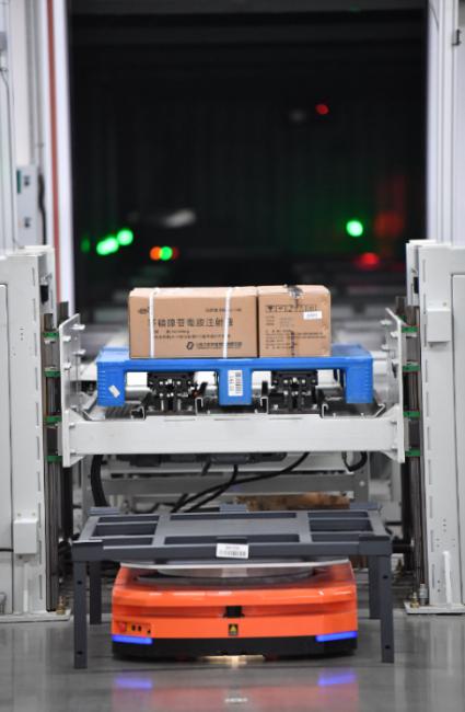 3 月 13 日,智能搬运机器人在咸阳医药工业集团现代物流仓搬运药品。新华社记者 李一博 摄