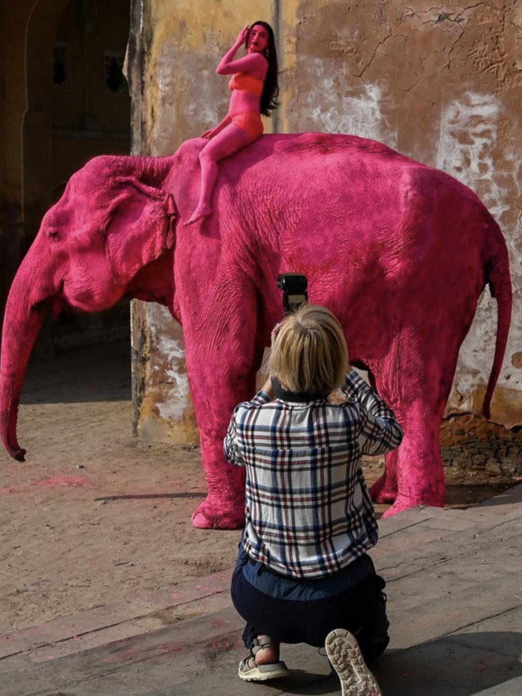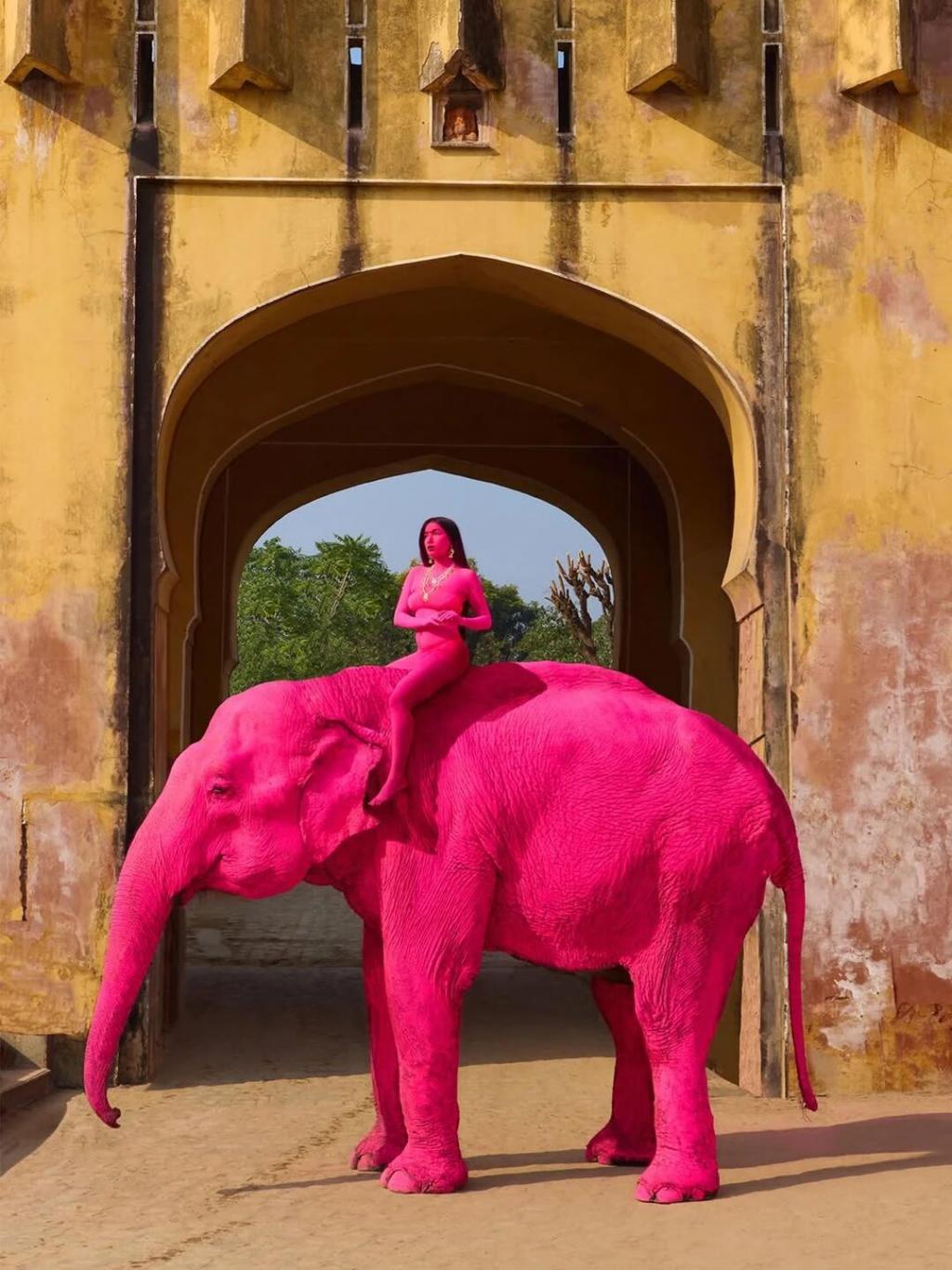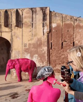 的确,如果真想要粉色的视觉效果,为啥不像印度当地人那样涂一点点粉色花纹,或者干脆把大象 P 成粉色,只让人类模特涂成粉色再来拍呢?