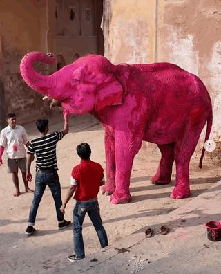 于是,接下来大家看到了这样的场景。一只已经65 岁高龄的大象,被饲养主牵着来到古门。一群人拿着调配好的粉色颜料,在茱莉亚的指导下,给它涂满了全身。